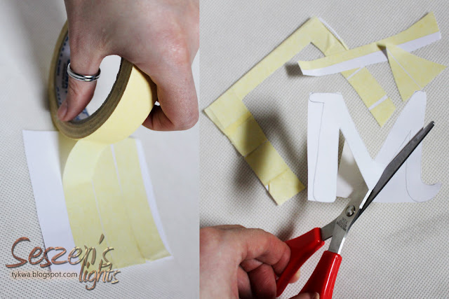 4. Kolejnym etapem jest stworzenie "naklejki" z naszej wydrukowanej litery. W tym celu podklejamy kartkę taśmą dwustronną, a następnie wycinamy literę. Teraz możemy odkleić jedną stronę taśmy klejącej i przykleić literę na tykwę.